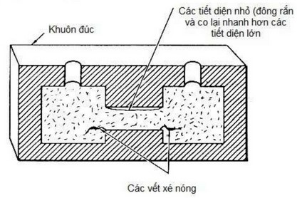 • Nguyện nhân: Do kim loại bị kìm hãm bởi đọ lún vủa khuôn và lõi kém. Những kim loại có độ kéo dài nhỏ ít bị nứt nóng.